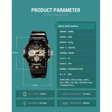 Analog and Digital Dual Mode with Luminance LED Afterglow. Jam tangan waterproof SKMEI AD2386 hadir dengan interface penunjuk waktu analog dan digital yang stylish, dilengkapi dengan lampu LED pada bagian dalam yang dapat menyala dalam situasi gelap. Dengan fitur-fitur seperti penunjuk tanggal, bulan, night light, waterproof dan stopwatch membuat jam ini semakin berguna. Kaca Jam tangan waterproof SKMEI AD2386 ini dibuat dengan material yang sangat jernih sehingga Anda tetap dapat melihat angka dengan jelas ketika di dalam air.